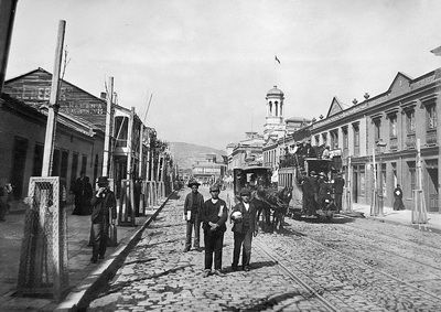 1902 Calle Victoria y dos tipos de carros de sangre por la línea