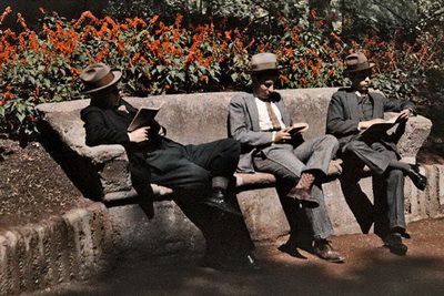 1929 Estudiantes leen en el Santa Lucía. Santiago. Fotografía a color.