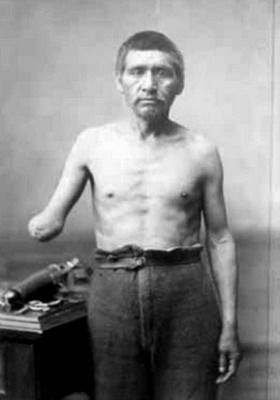 Fotografias pertenecientes a mutilados de la Guerra del Pacífico, mostrando su parte afectada y en algunos casos el aparato ortopédico.