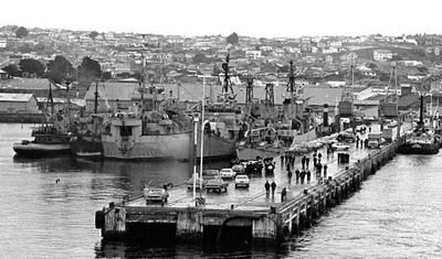 1978 Muelle de Punta Arenas. Patrullero Lientur. remolcador Colocolo. buque de desembarco Aguila. transporte rápido Uribe y Serrano. Armada de Chile