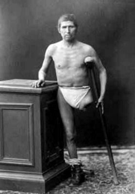 Fotografias pertenecientes a mutilados de la Guerra del Pacífico, mostrando su parte afectada y en algunos casos el aparato ortopédico.